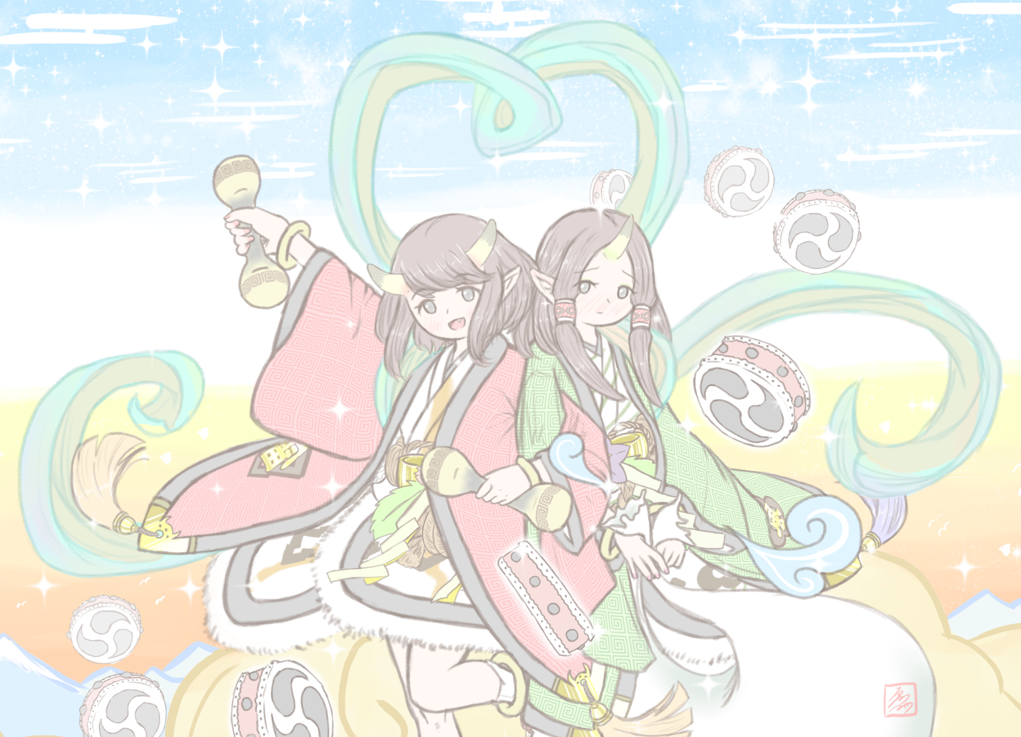 <雷太鼓で舞うのが大好きなアウトドア雷神> さーさーかみなりかみなりー! あっちは晴れてるけどいったれー! ドーン! ドーン! <さっさと帰って動画みたりゲームしたいインドア風神> ねー……お仕事終わったんなら帰ろうよー ねー